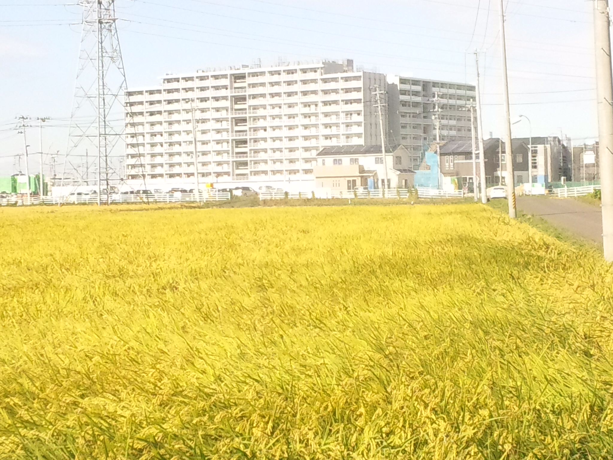 津波被災地・仙台市若林区の田んぼの中に、巨大な集合住宅がいよいよ姿を現しました。復興住宅です。いままでは足場とシートにおおわれていました。折しも仙台平野は実りの秋。黄金色に広がる一面の稲穂のむこうに立ち上がった高層アパートをみるにつけ、やっとここまできたかとの思いが沸き上がります。