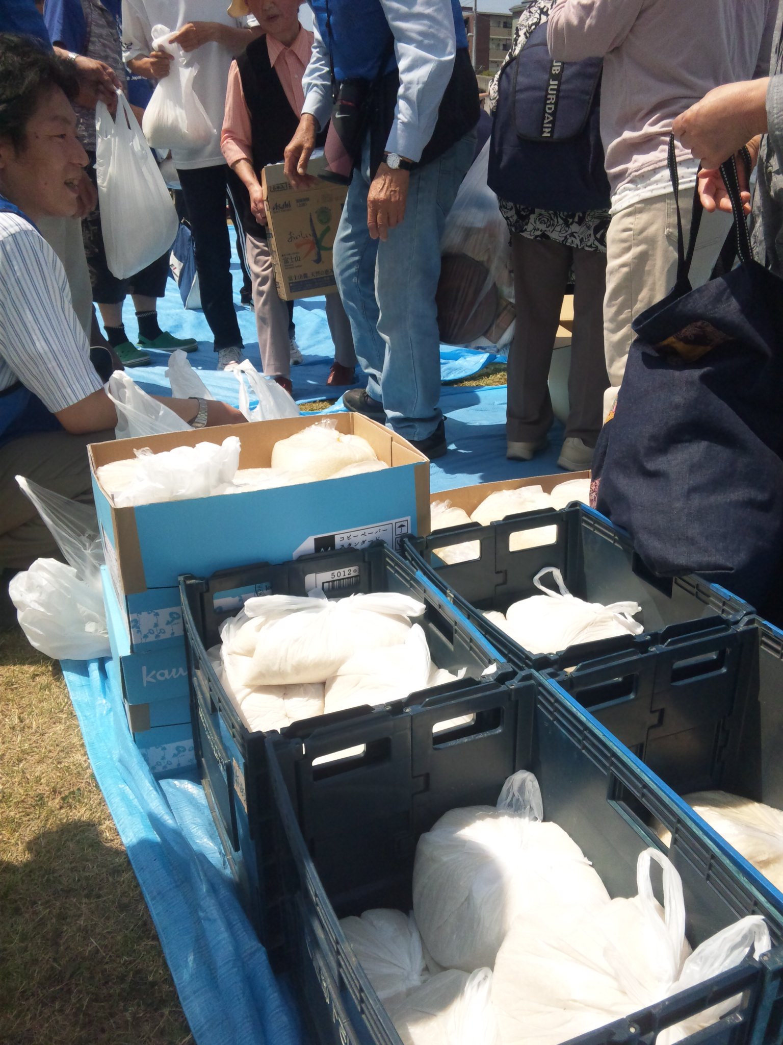 今回はお米が豊富。埼玉、群馬の仲間が大量に送ってくださったのに加え、当日駆けつけた山形の仲間の車から、さらに米袋がおろされました。2キロづつ小分けして一世帯一袋のつもりで準備していましたが、急きょ一人一袋に切り替えました。