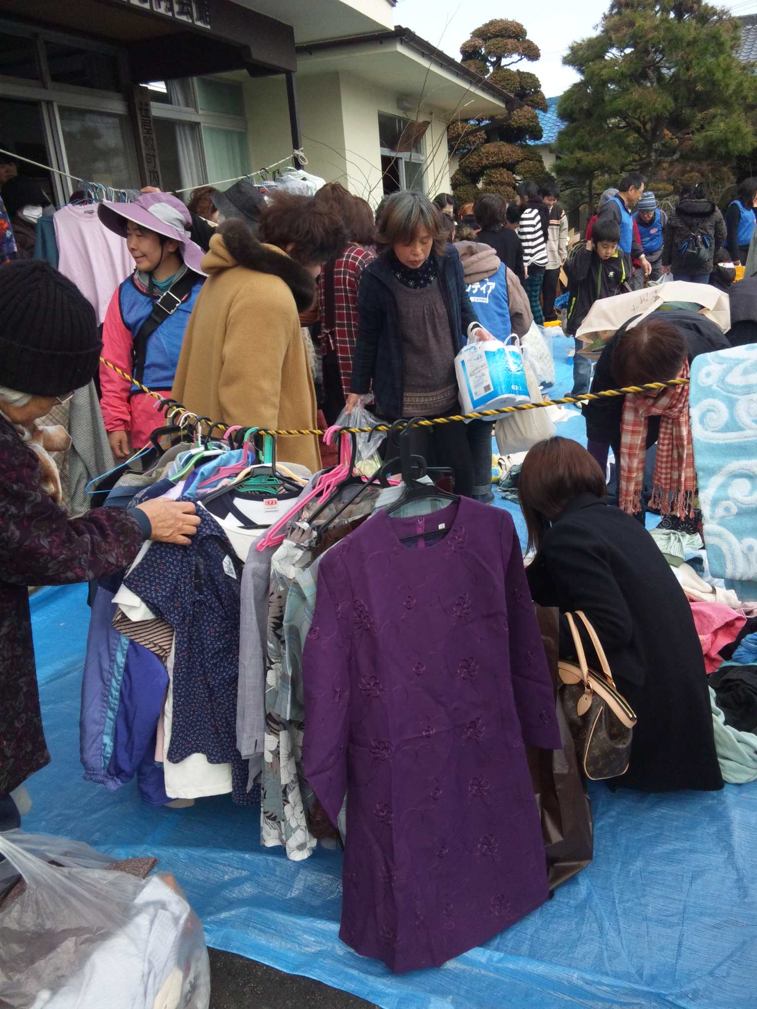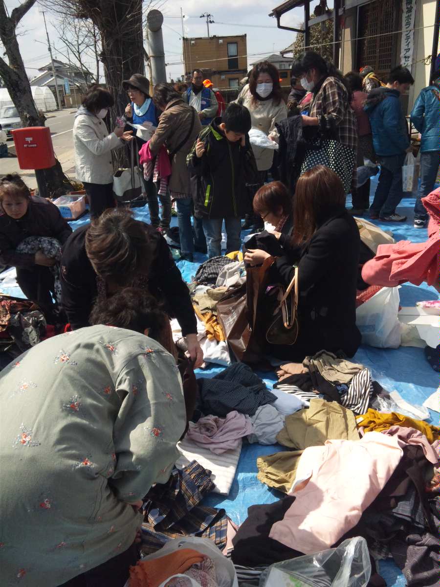 午後1時開始予定ですが、早い人は正午には並び始めたのいつもと同じ。準備で並べている支援物資を遠目にみながら「あの服、あんたに似合うんでないの?」「タオルケットのコーナーは集会所の中だな。ダッシュしないと」など品さだめがはじまります。列が伸び始めると「久しぶり~!」「○○ちゃんでね~の!?、あんたどこさ避難してんの?」などと被災者同士の交流もはじまります。とっても楽しそう。こういう場は、物を提供するにとどまらず、情報の交流、心の交流も提供する場になっていることをつくづく感じさせられます。