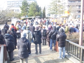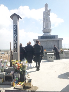 写真は今日の仙台市若林区荒浜です。日差しは春の明るさですが、強く冷たい風は、震災当日の冬の気候を思わせます。その風のなか、次々と人が訪れて、供養塔に手を合わせていました。