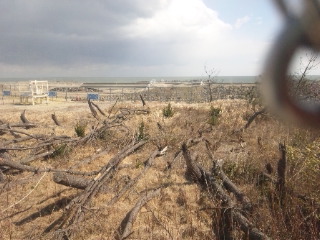 供養塔の裏はすぐ浜。何事もなかったかのように穏やかにうねる波と、津波になぎ倒されたまま放置されている松の倒木が対照的です。