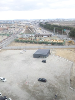 北側には建設途中の地下鉄東西線の荒井駅と操車場が俯瞰できます。南側からは正面に広がる仙台平野、右手に蔵王連峰、左手に太平洋。眼下すぐ脇には、津波で生死を分けた東部道路が伸び、行き来する車も見えます。
