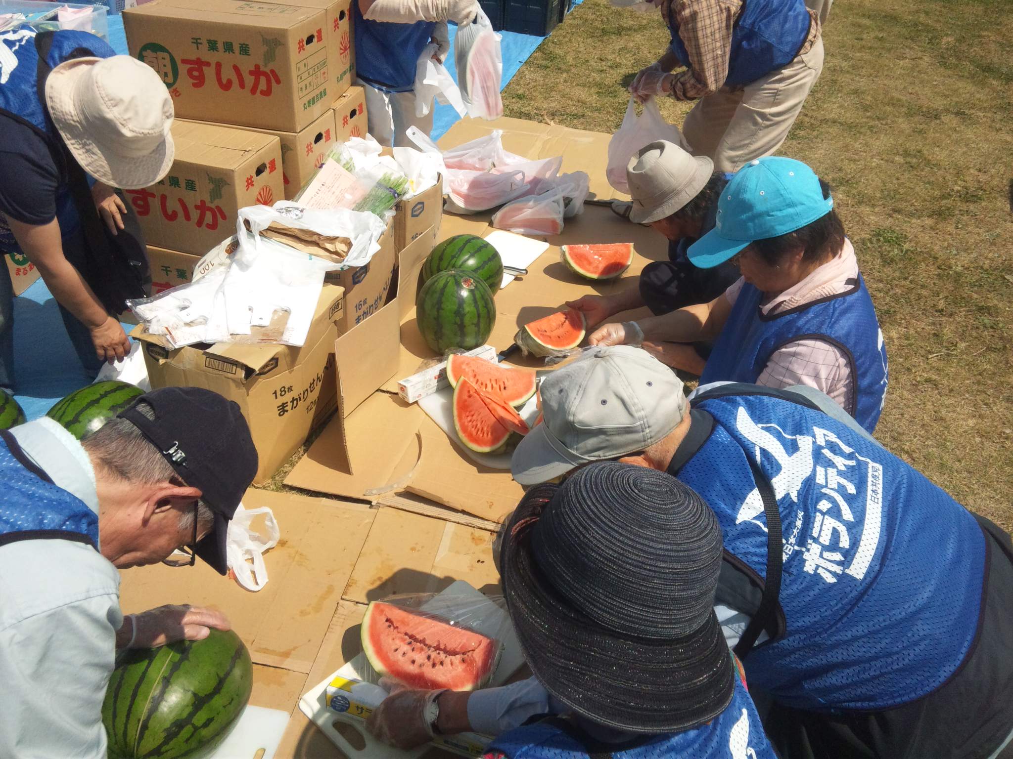 季節といえば、「ニーズにあうものをそちらで用意して!」と東京はじめ全国から今回のお届け会に合わせ提供された現金で、ボランティアセンターでは大玉スイカを用意しました。さすがに丸まんま1個配布とはいかず、1世帯1/4カットの制限付きでしたが、この日は夏日だったこともあり「おっ、初物」「スゲー」などの声が・・・・。その他、数台あった扇風機も、夏掛けやタオルケットも、あっと言う間に参加者の手元に渡りました。
