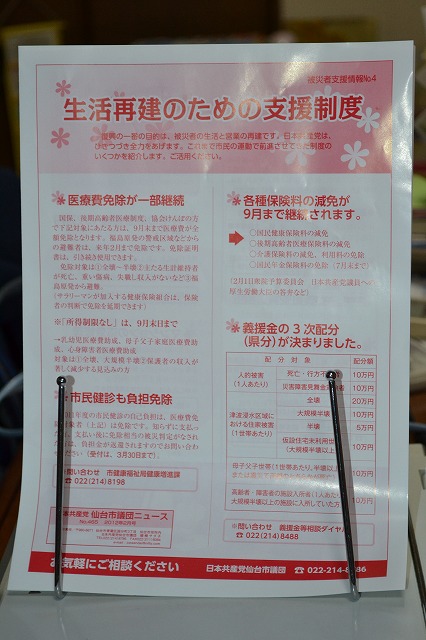 共産党仙台市議団から、仙台市在住の被災者の皆さんが現在の時点で使える制度をまとめたリーフレットが発行されています。
